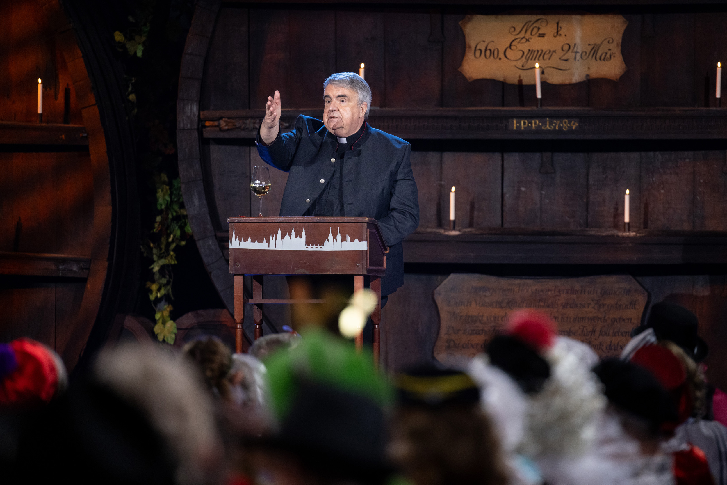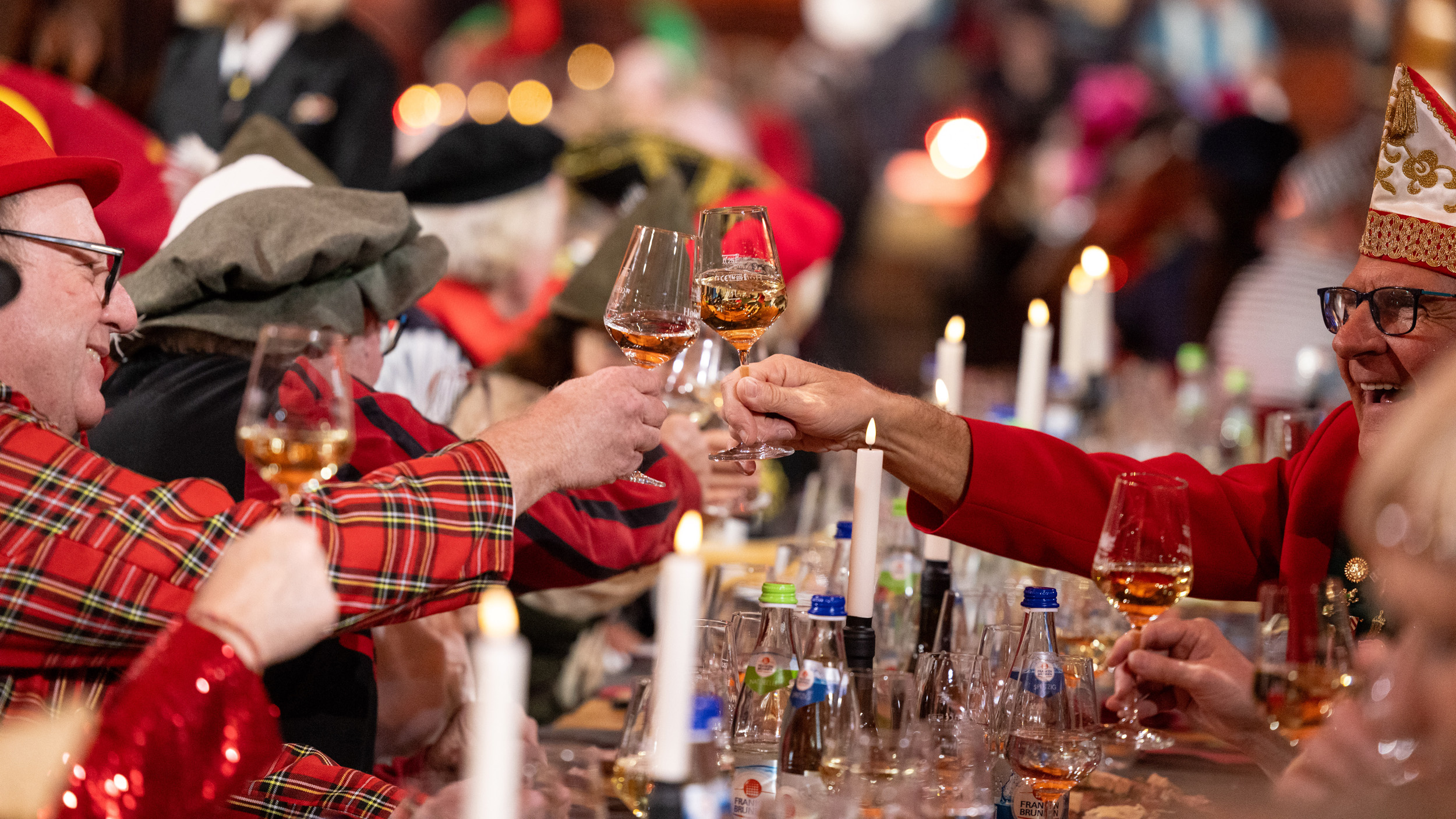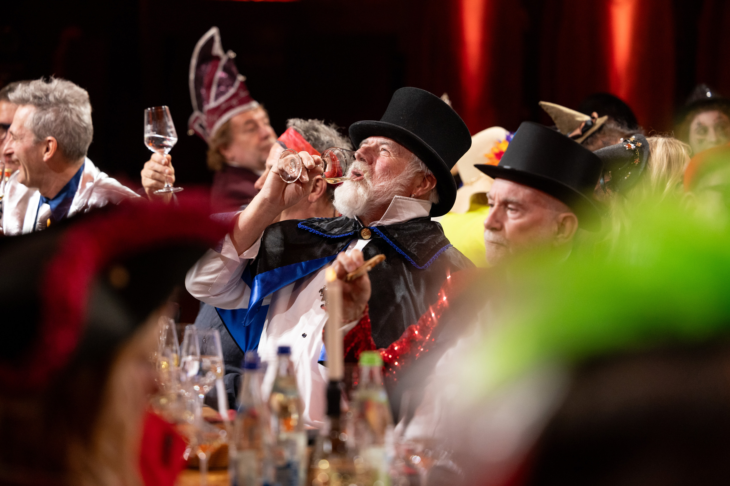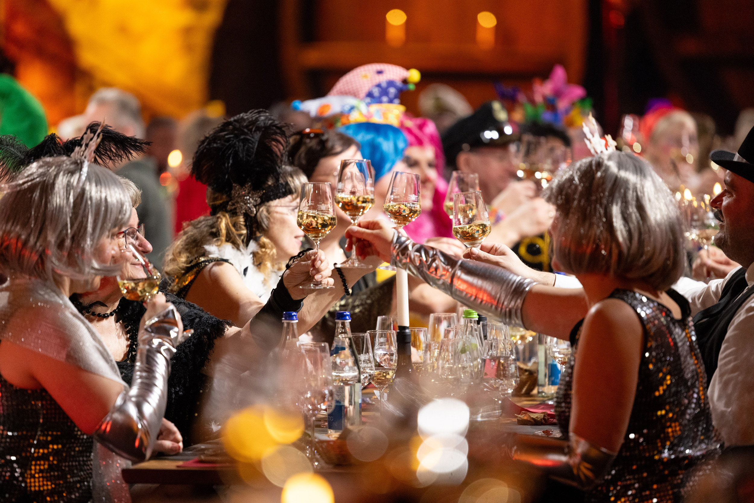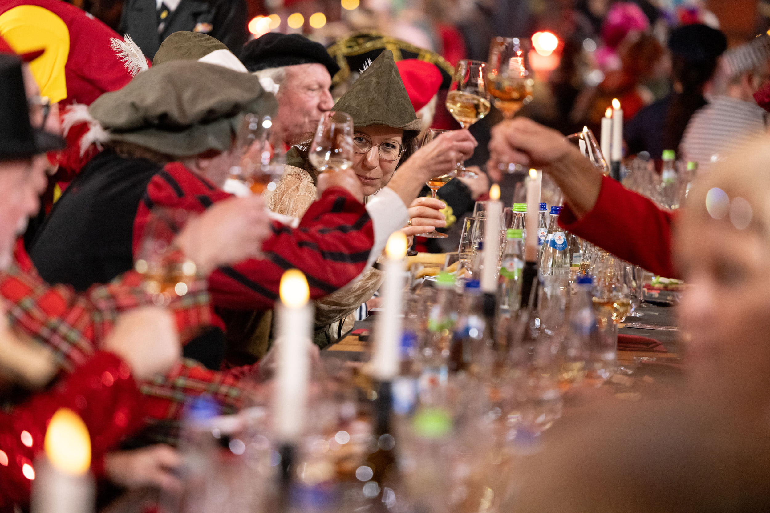 Zahlreiche Närrinen und Narren aus Politik und Gesellschaft besuchen am Sonntag (12. Januar 2025) im Staatlichen Hofkeller der Residenz in Würzburg die Närrische Weinprobe.