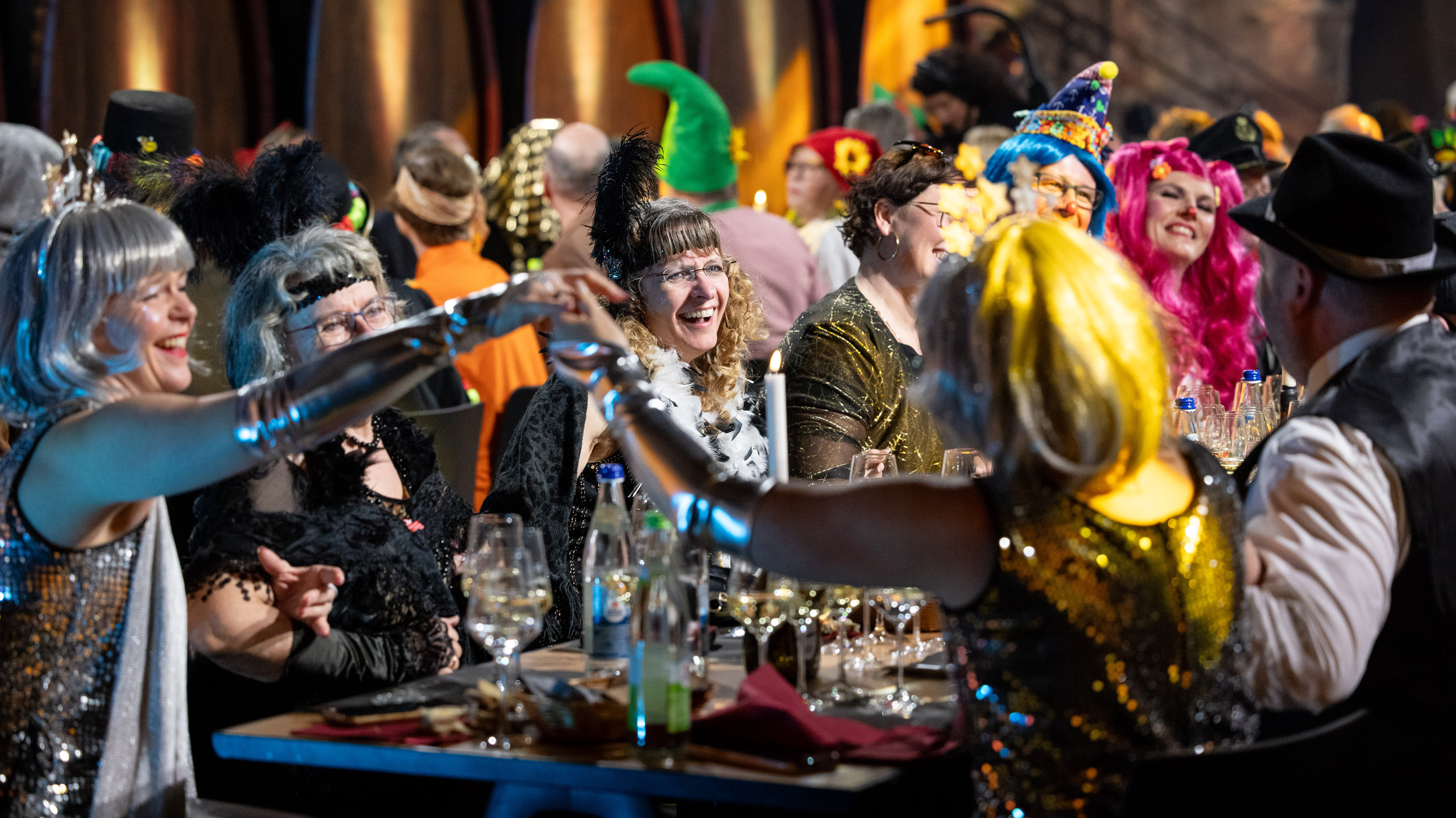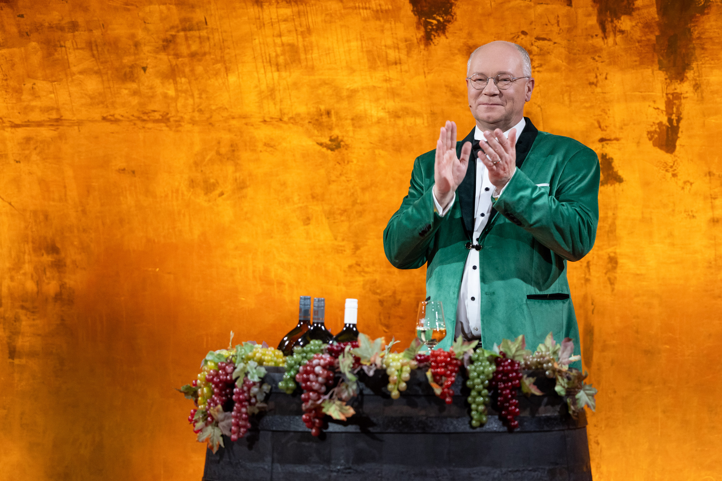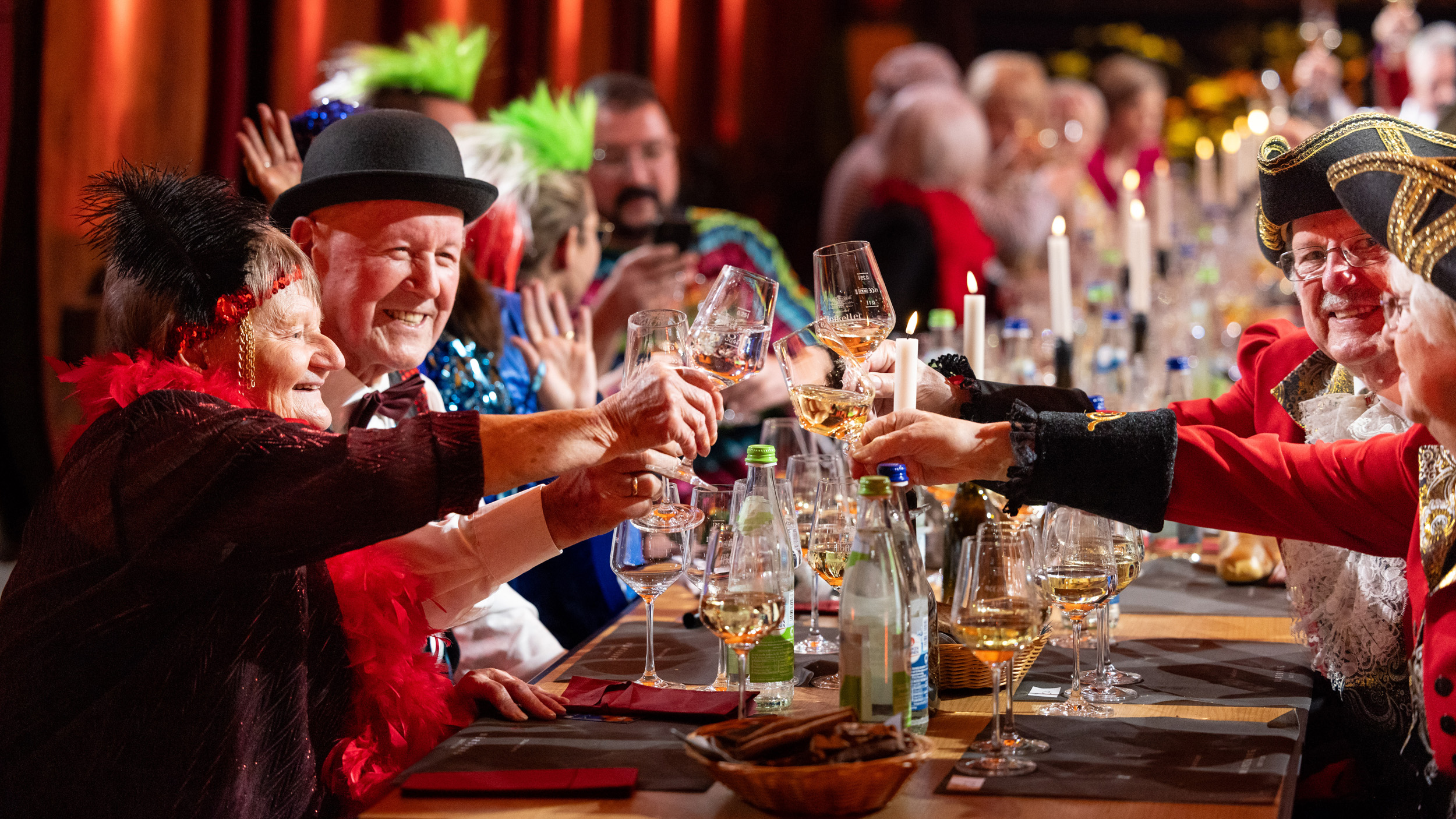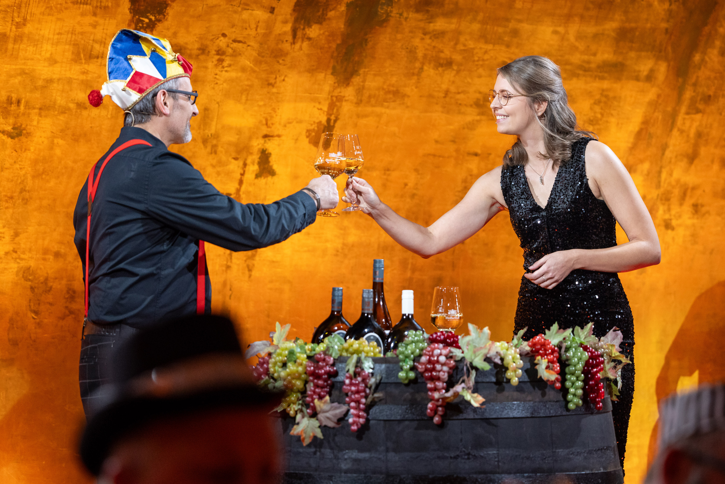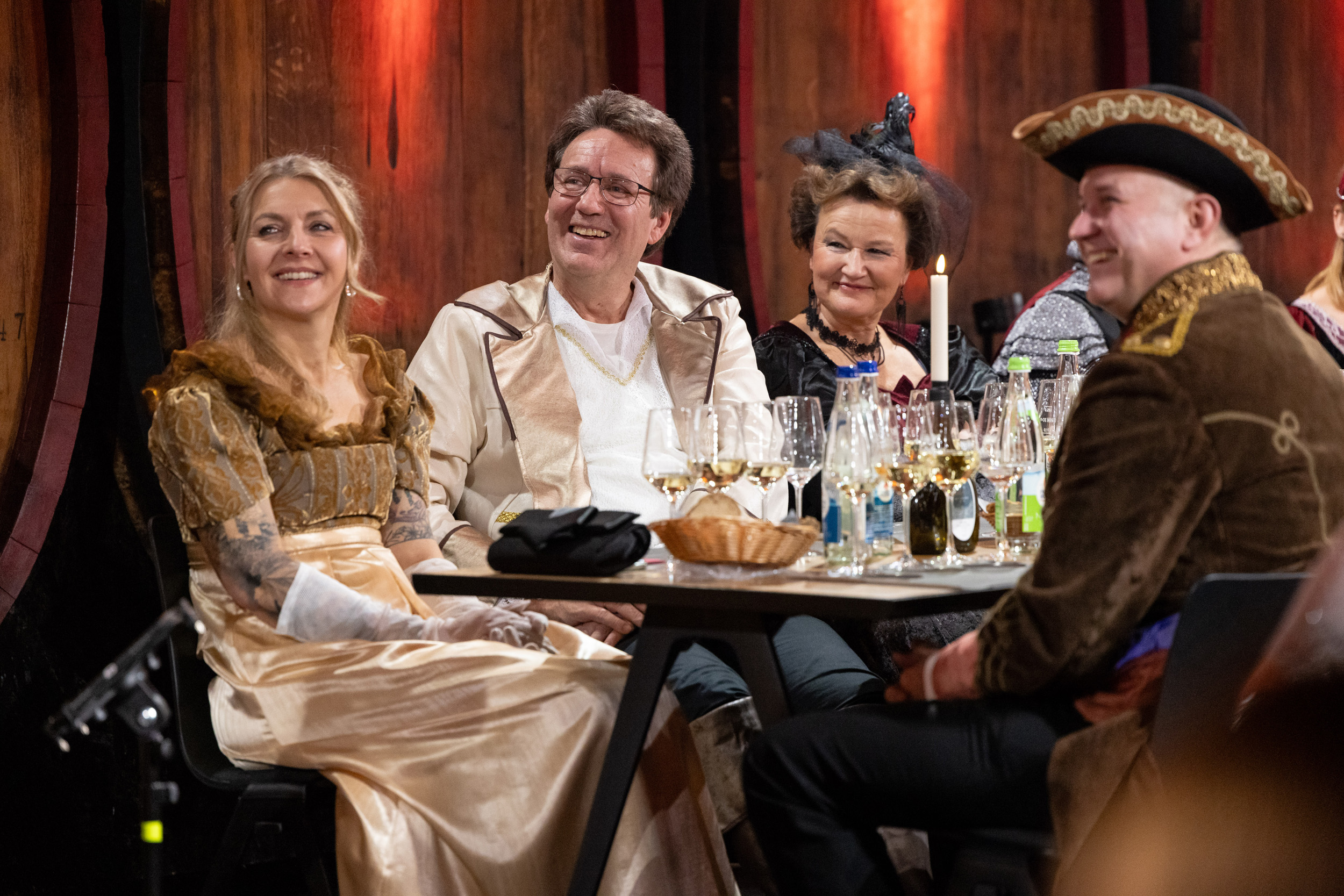 Zahlreiche Närrinen und Narren aus Politik und Gesellschaft besuchen am Sonntag (12. Januar 2025) im Staatlichen Hofkeller der Residenz in Würzburg die Närrische Weinprobe.
