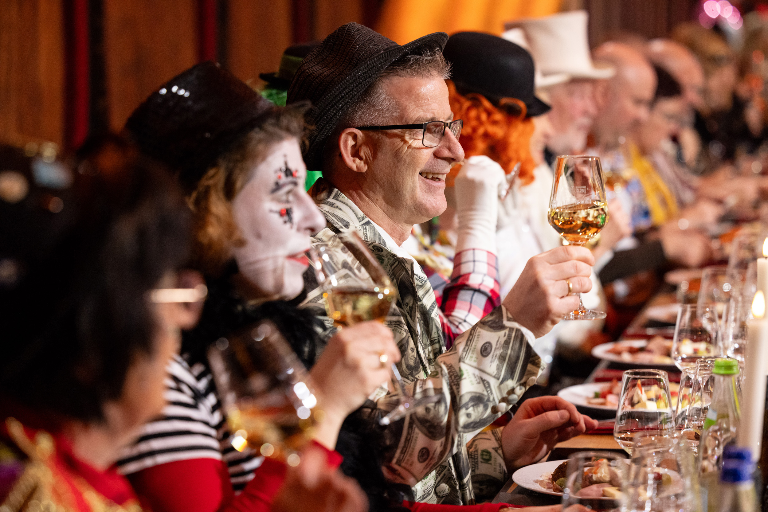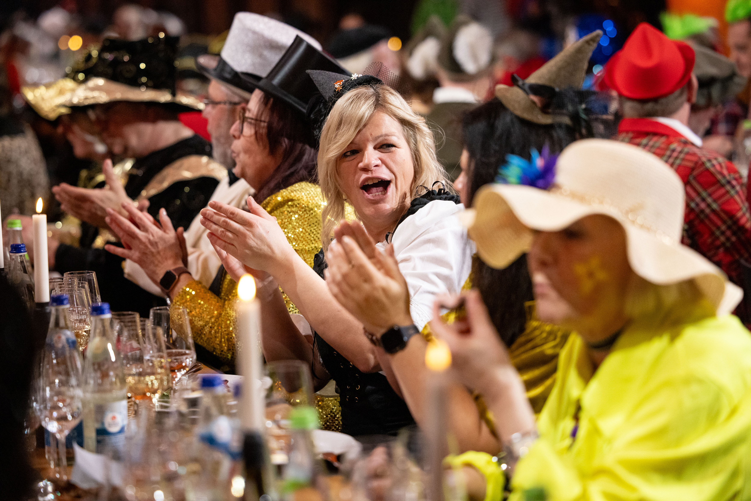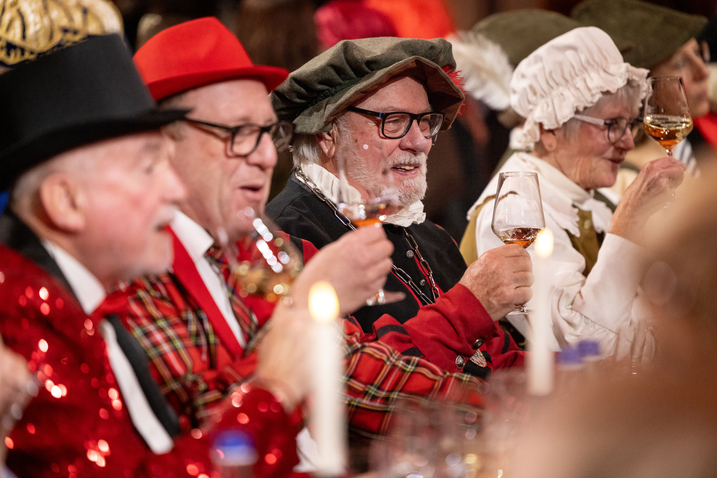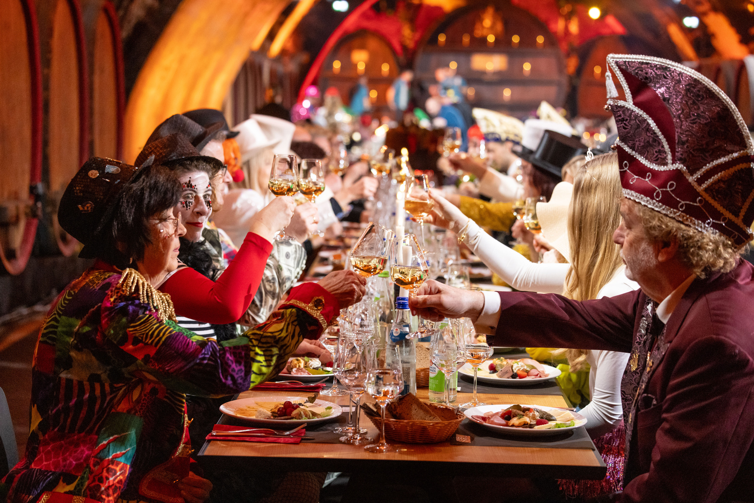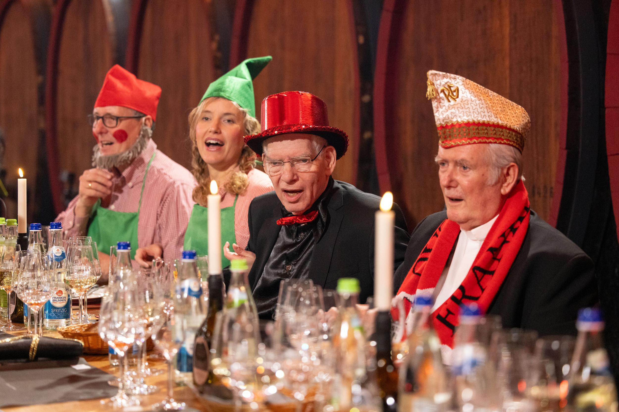 Zahlreiche Närrinen und Narren aus Politik und Gesellschaft besuchen am Sonntag (12. Januar 2025) im Staatlichen Hofkeller der Residenz in Würzburg die Närrische Weinprobe.
