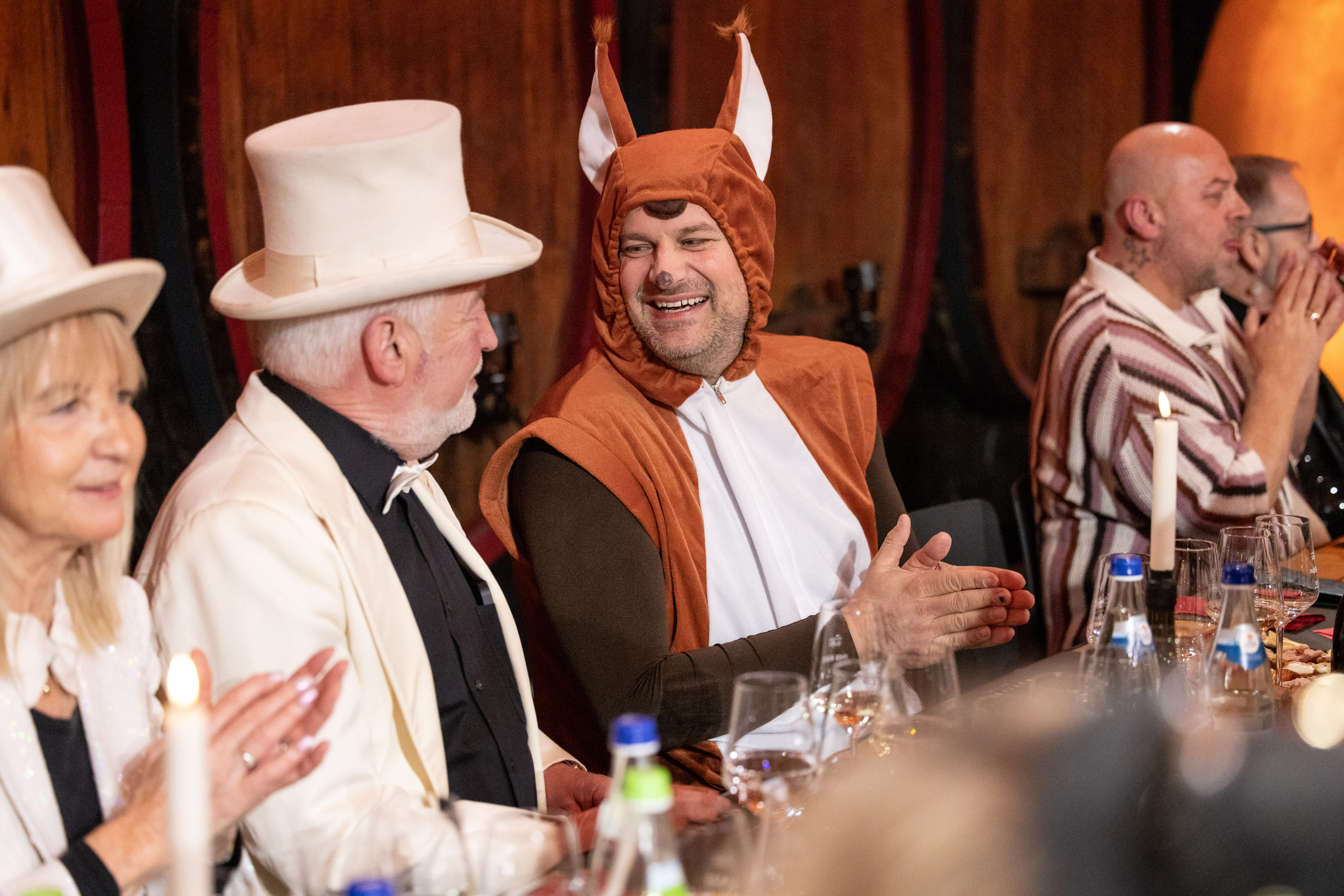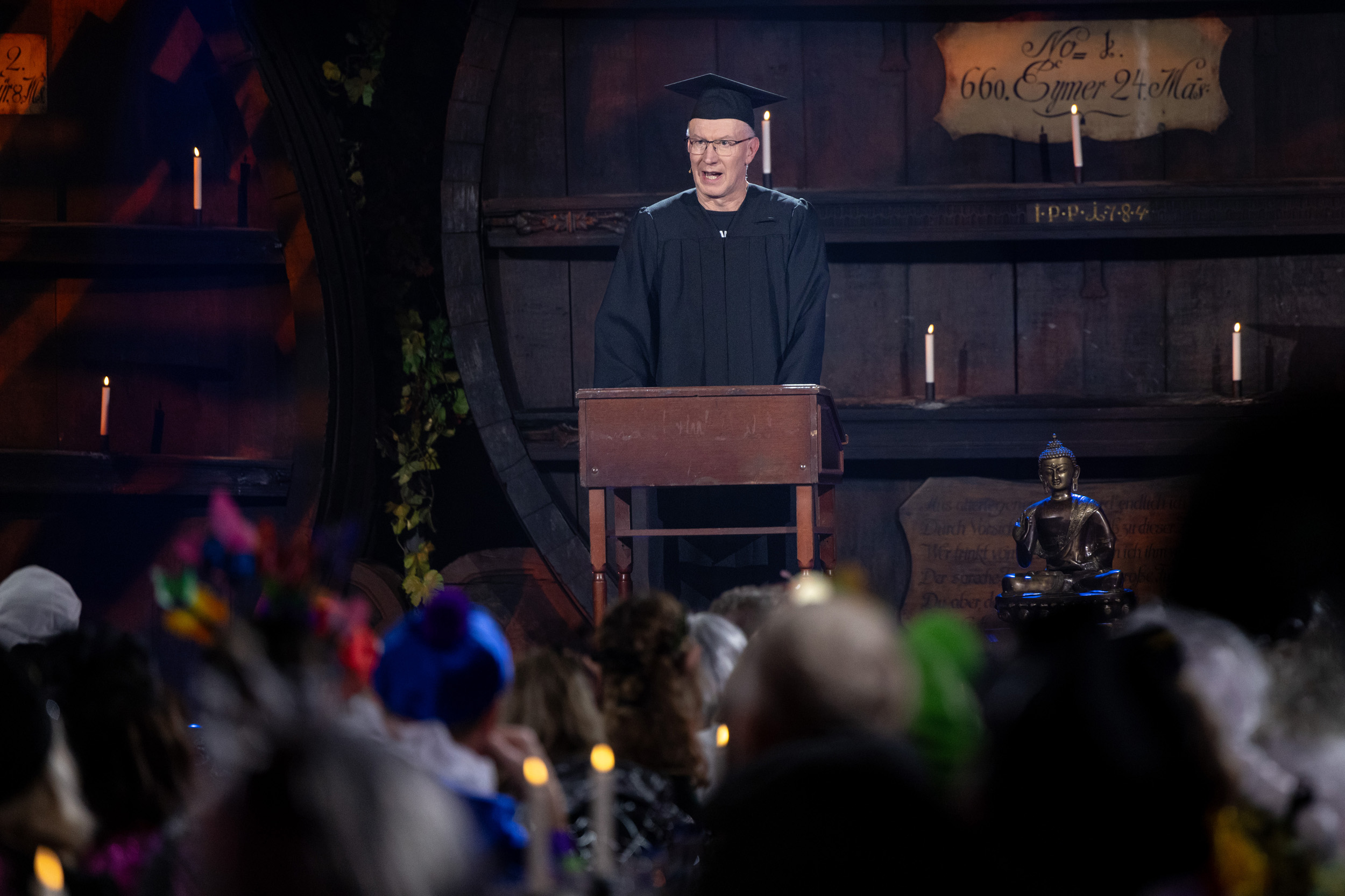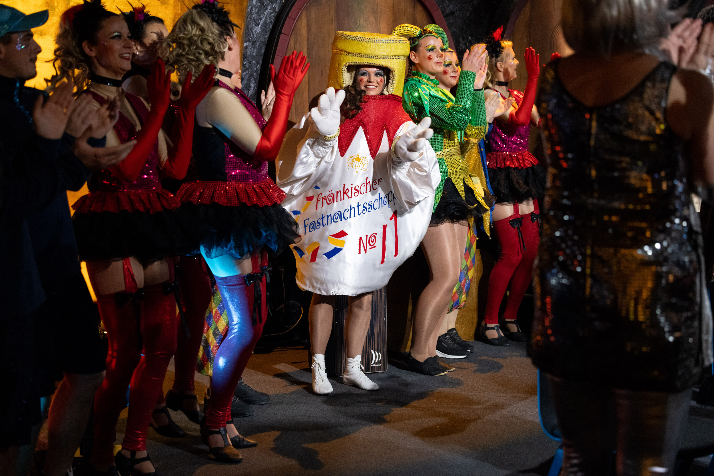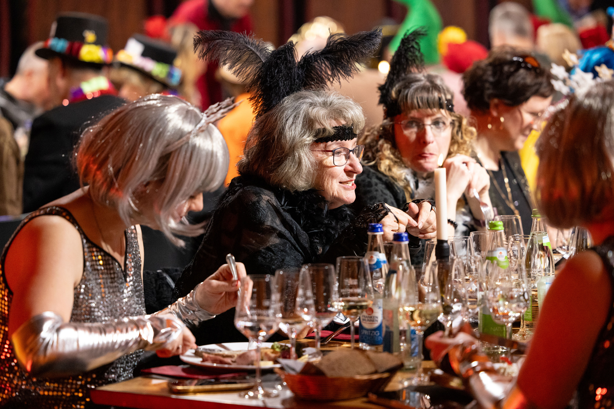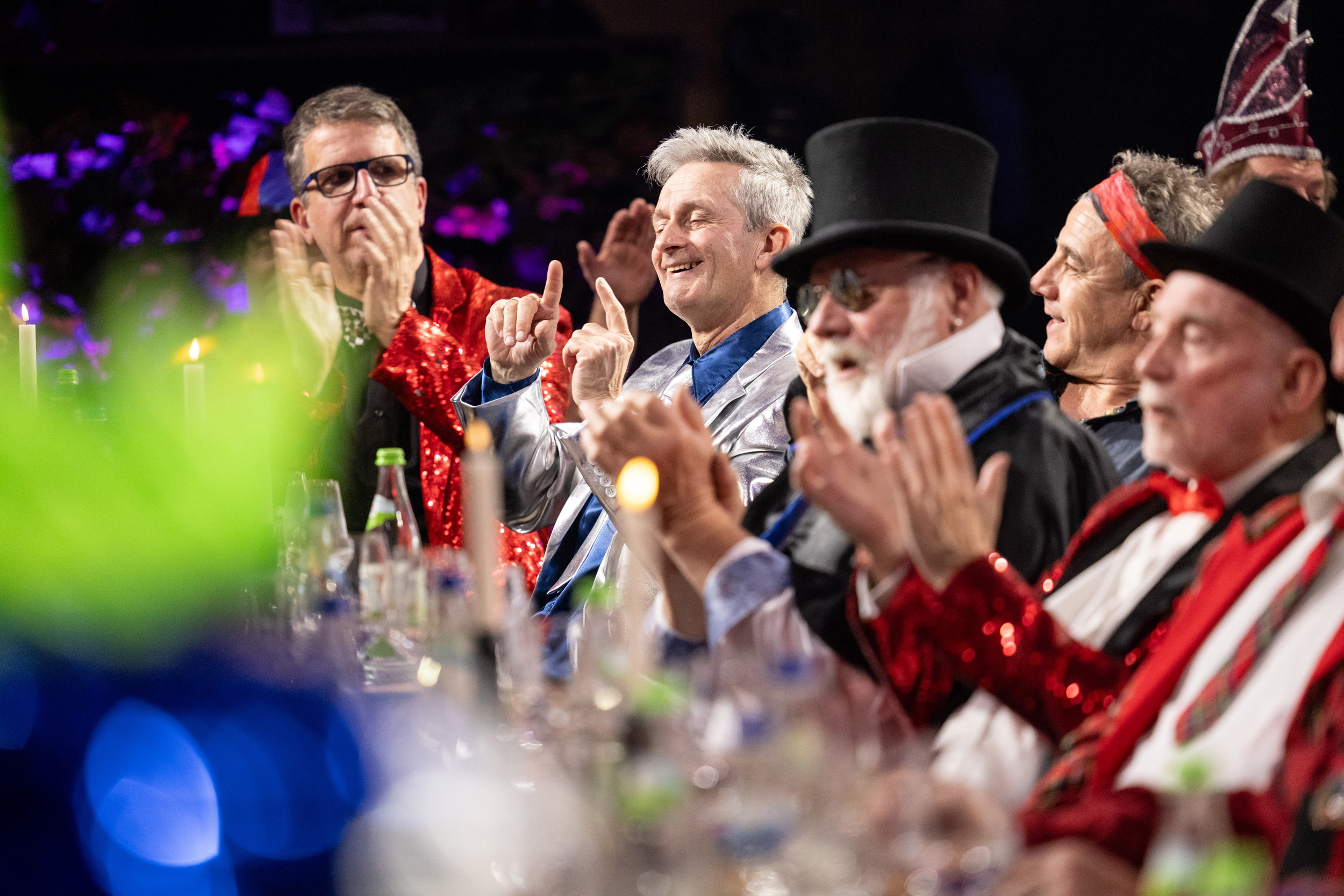 Zahlreiche Närrinen und Narren aus Politik und Gesellschaft besuchen am Sonntag (12. Januar 2025) im Staatlichen Hofkeller der Residenz in Würzburg die Närrische Weinprobe.